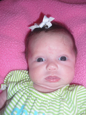 We've tried many times to get a good picture of her for a birth announcement. Her eyes were always closed, or I would forget to put a bow in her hair. We got this one yesterday. Even though it's not great, it will have to do! I ordered the announcements today, and they'll come in sometime next week. You can see her double chin and not-quite-focused eyes!!